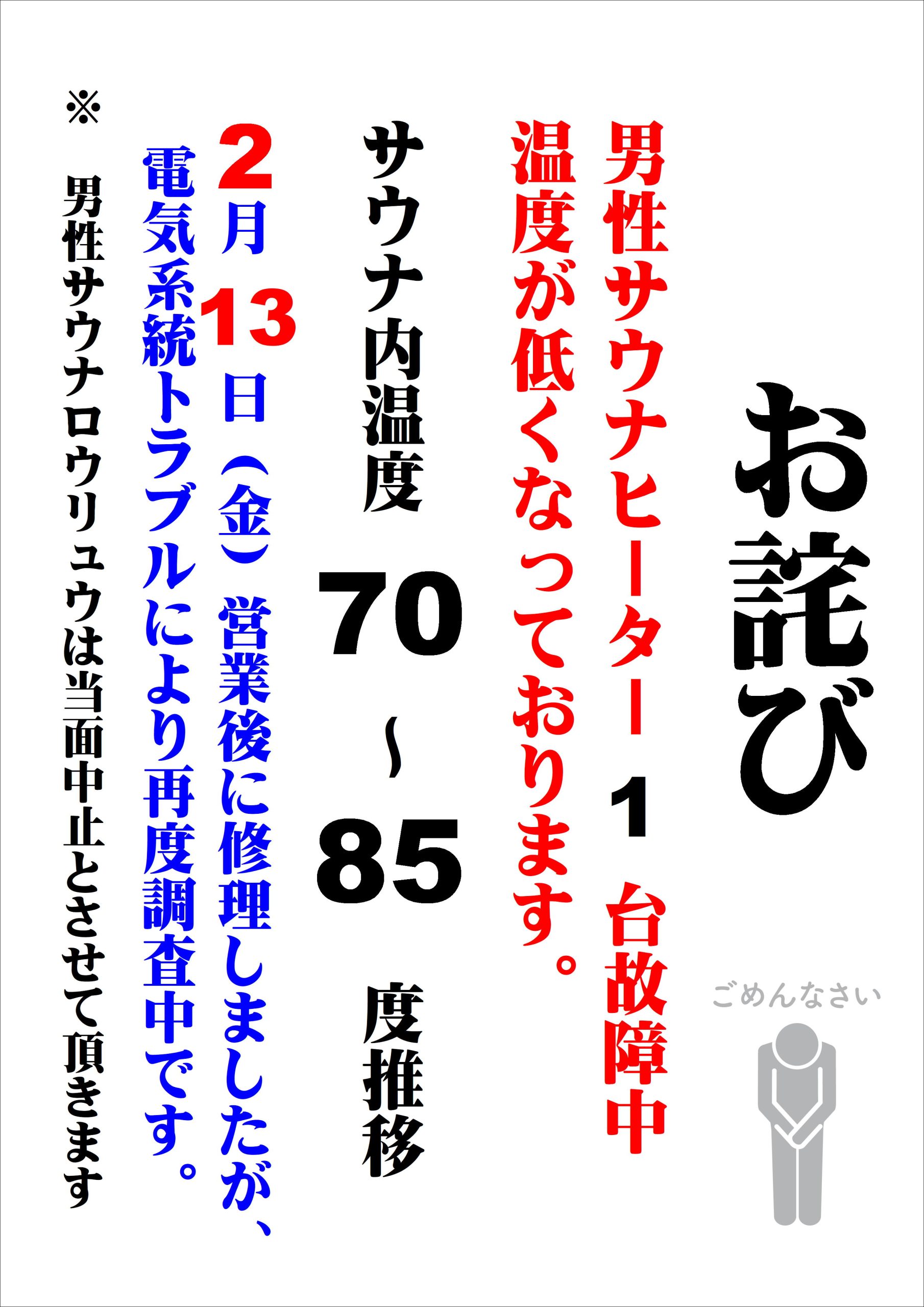 男性サウナ室ヒーター入替後の電気系統トラブルにより原因調査中